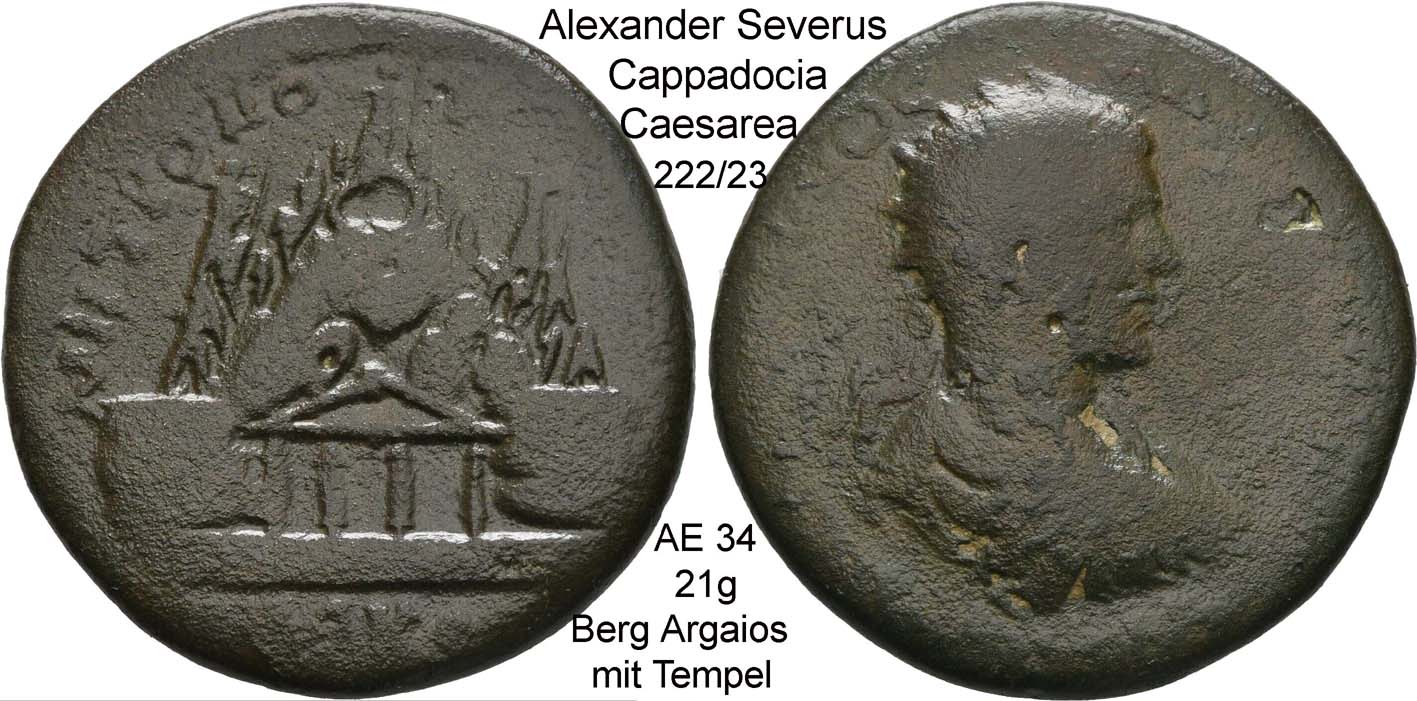 Die Münze des letzten Kinderkaisers der severischen Dynastie Alexander Severus zeigt rückseitig Argaios, davor eine viersäulige Tempelfront, links und rechts davon je eine große Preiskrone oder-urne. Der Berg ist deutlich mit seinen drei Hauptgipfeln zu sehen.