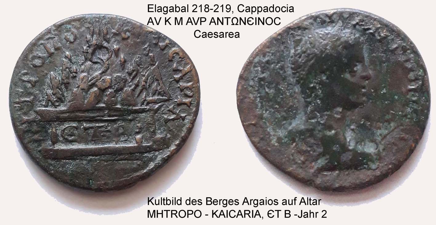 Auf der Münze des Kinderkaisers und syrischen Sonnenpriesters Elagabal ist im Revers Argaios als Agalma auf altarartiger Basis dargestellt.