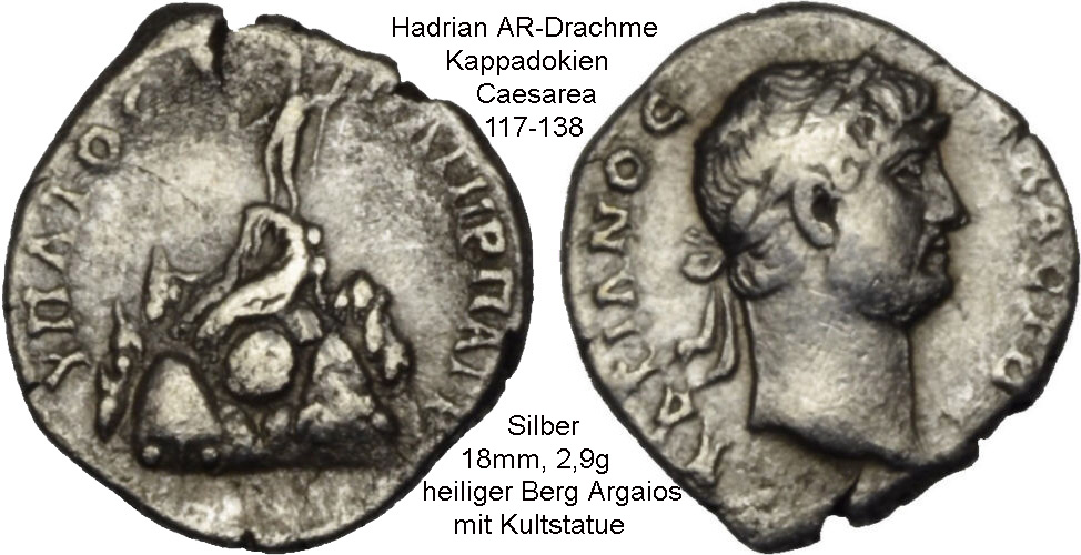 Auf dem Revers der Silberdrachme des Hadrian sieht man den Berg Argaios mit stehender Figur. Die Darstellung kann auf die Wohnstatt des Berges für den Gott hindeuten oder eine quasimenschliche Personifikation des Gottes symbolisieren.