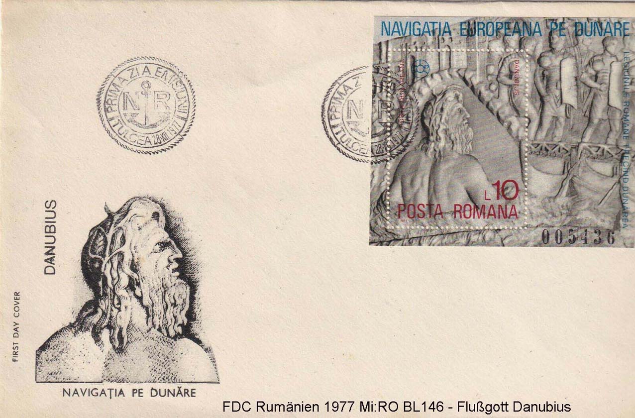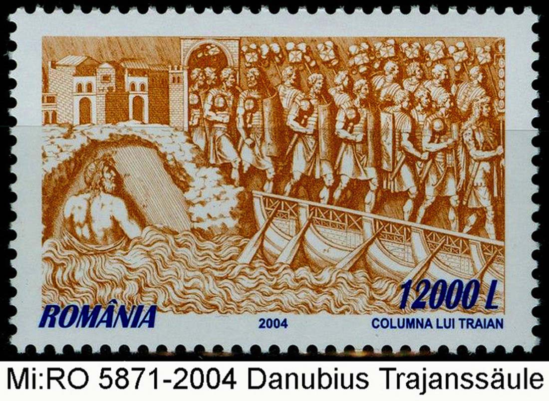 Der rumänische Briefmarkenblock zeigt ein Detail der Trajanssäule. Der Flußgott schaut auf die Donaubrücke, die von den Legionen überquert wird.
