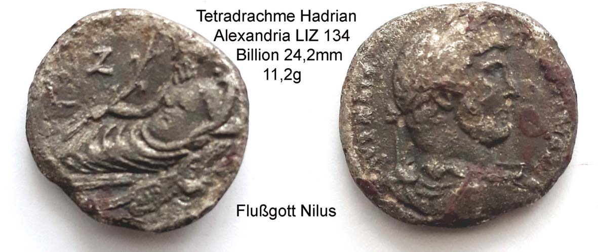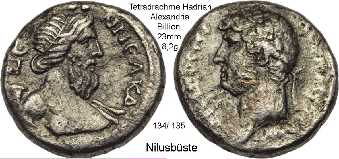 "Die lebenswichtige Bedeutung des Nils für die Landwirtschaft und damit die Nahrungsmittelversorgung Ägyptens in der Antike wird deutlich an den zahlreichen Darstellungen des Flußgottes auf den alexandrinischen Münzen. Die alljährlichen Überschwemmungen lieferten den fruchtbaren Nilschlamm, der reiche Ernten brachte. Wie entscheidend eine hohe Überflutung und entsprechend reichliche Schlammablagerungen für gute Erträge waren, zeigt sich daran, daß die zu leistenden Abgaben der Bauern sich nach dem jeweiligen Höchstwasserstand eines Jahres bemaßen. Zur Feststellung dieses Pegels diente ein sogenannter Nilometer, ein streng verschlossenes Gehäuse, in dem der Pegel an einer Skala abzulesen war. Diese Ablesung war ein sakraler Akt, der von Priestern vorgenommen wurde. Ein Pegel von sechzehn hellenistischen Ellen wurde dabei als wünschenswerter Normalfall angesehen und ist auf vielen Münzen mit der Abbildung eines ruhenden Nilus angegeben als Zeichen, daß für die kommende Ernte nun nichts mehr zu befürchten sei." Quelle Numismatikforum