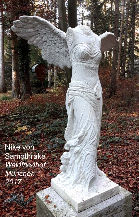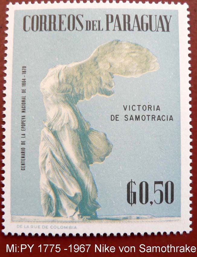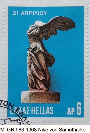 Die Skulptur der Nike von Samothrake wurde 1863 auf der ägäischen Insel entdeckt und befindet sich heute im Louvre. Sie wurde etwa 190 v.u.Z. aus Marmor gefertigt und hat eine Höhe von 3,28m. Sie befand sich auf einer Terrasse des Heiligtums der Großen Götter. Die Skulptur entstand wahrscheinlich anläßlich eines Seesieges.
