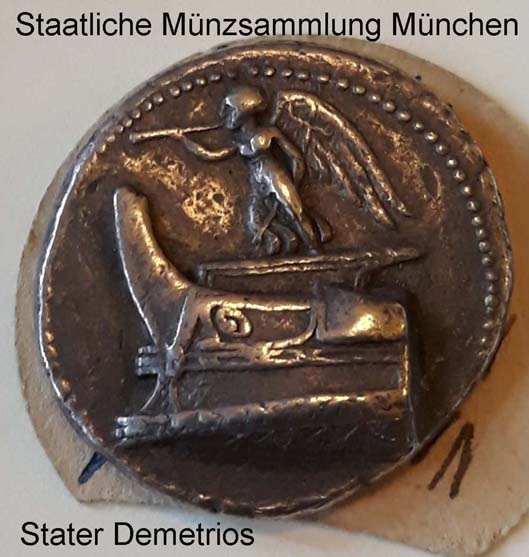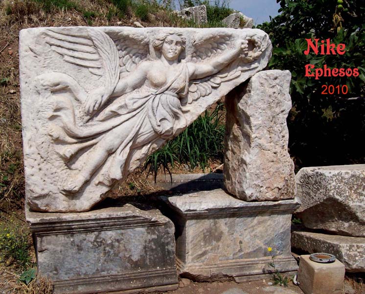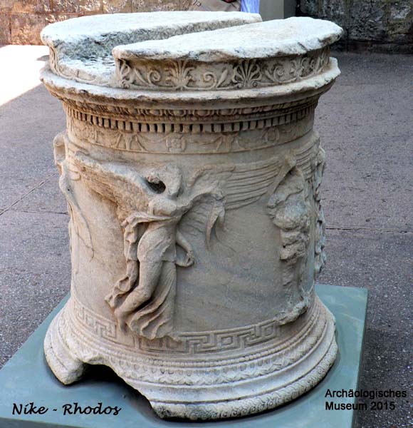 Die schwebende Nike aus Ephesos wurde im 1. Jhd. v.u.Z. aus Marmor gefertigt und war Bestandteil des Heraklestores am Anfang der Kuretenstraße. Die schreitende Nike auf dem Säulenpostament befindet sich im Garten des Archäologischen Museums in Rhodos.