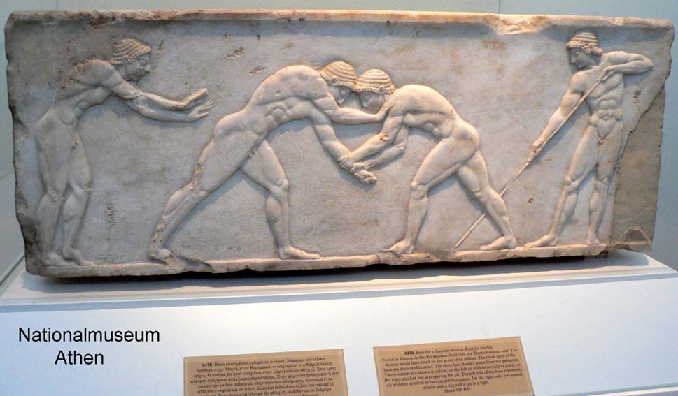 510 v.u.Z. Das Frontrelief zeigt zwei Ringer in Aktion. Links von ihnen sieht