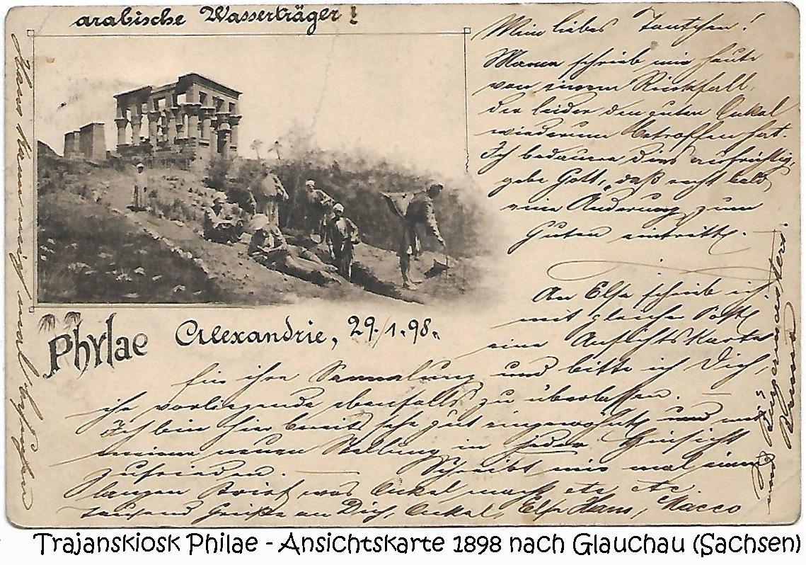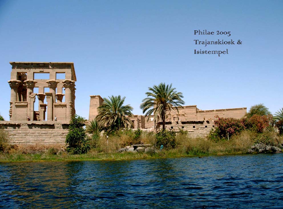 "Südlich des kleinen Hathor-Tempels und wie dieser am Ostufer der Insel gelegen steht der Trajan-Kiosk. Mit ihm wurde eine Ost-West-Prozessionsachse vom Inselufer zum Haupttempel geschaffen. Er besteht aus 14 mittels Zwischenmauern verbundenen Säulen mit glockenförmigen Papyruskapitellen unter einem umlaufenden Epistyl, das einst eine Holzkonstruktion zur Stützung eines Zeltdaches trug. An der östlichen Terrasse legte bei Flussprozessionen die heilige Barke mit der Statue der Göttin Isis an. Der Trajan-Kiosk ist mit 15,4 × 20,7 Meter bei einer Höhe von 15,45 Meter der größte erhaltene freistehende Kiosk Ägyptens. Auf Grund zweier Reliefs, die Kaiser Trajan als opfernden Pharao vor den Göttern Isis, Osiris und Horus als Kind zeigen, wurde das Bauwerk meist diesem Kaiser zugeschrieben. Der Trajan-Kiosk wurde jedoch schon unter Kaiser Augustus erbaut und später durch Trajan wiedererrichtet. Nach Dietrich Wildung blieb der Bau jedoch unvollendet, da Reliefs und Inschriften fehlen." Quelle Wikipedia
