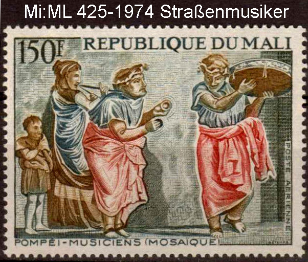 Das 1763 in der "Villa des Cicero" bei Ausgrabungen in Pompeji aufgefundene Mosaik zeigt eine Szene mit Straßenmusikanten. Der rechte Tympanon-Schläger (Tamburin) trägt eine Jünglingsmaske. Er wird von einem zweiten Tänzer mit Zimbeln (Schallbecken) begleitet. Eine nebenstehende Flötistin spielt die Aulos, ein antikes Rohrblattinstrument mit zwei konischen nicht verbundenen Melodieröhren. Die Flötenspielerin trägt eine Hetärenmaske.