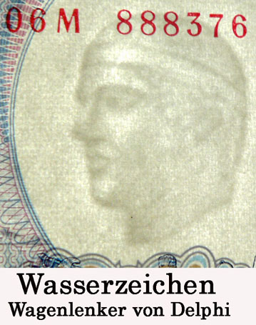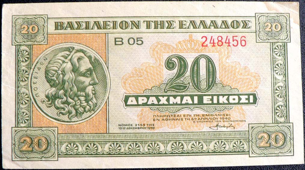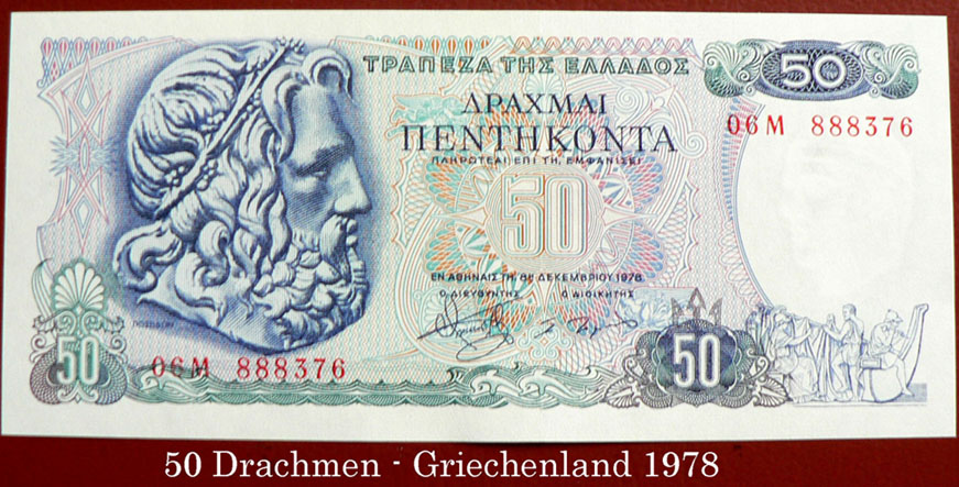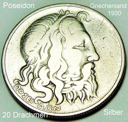 Auf der griechischen 50-Drachmen-Banknote sieht man den Kopf des Poseidon, im Wasserzeichen den Kopf der Bronzefigur des Wagenlenkers von Delphi. Auf dem 20-Drachmenschein von 1940 und der griechischen Silbermünze aus dem Jahr 1930 ist ein antikes Münzbildnis des Meeresgottes zu sehen.