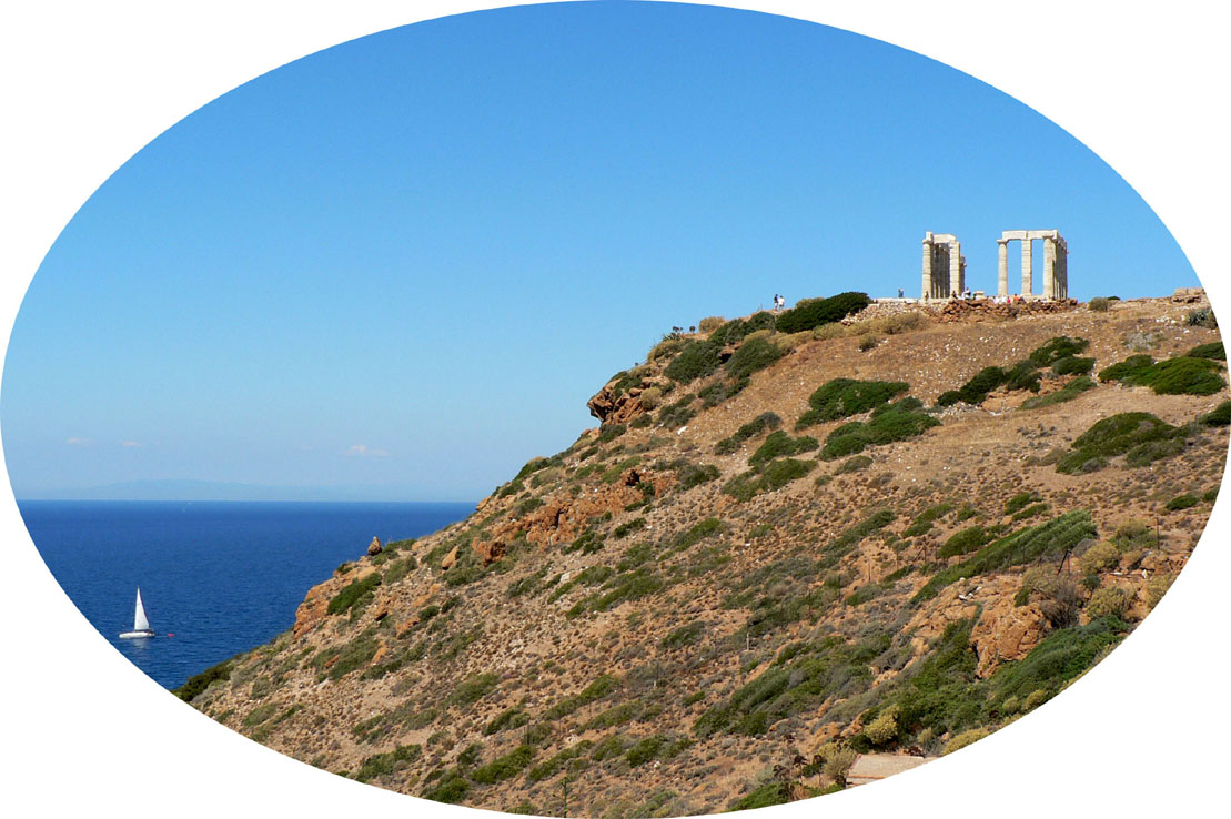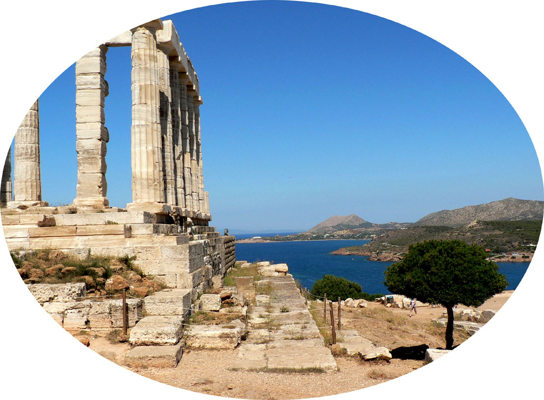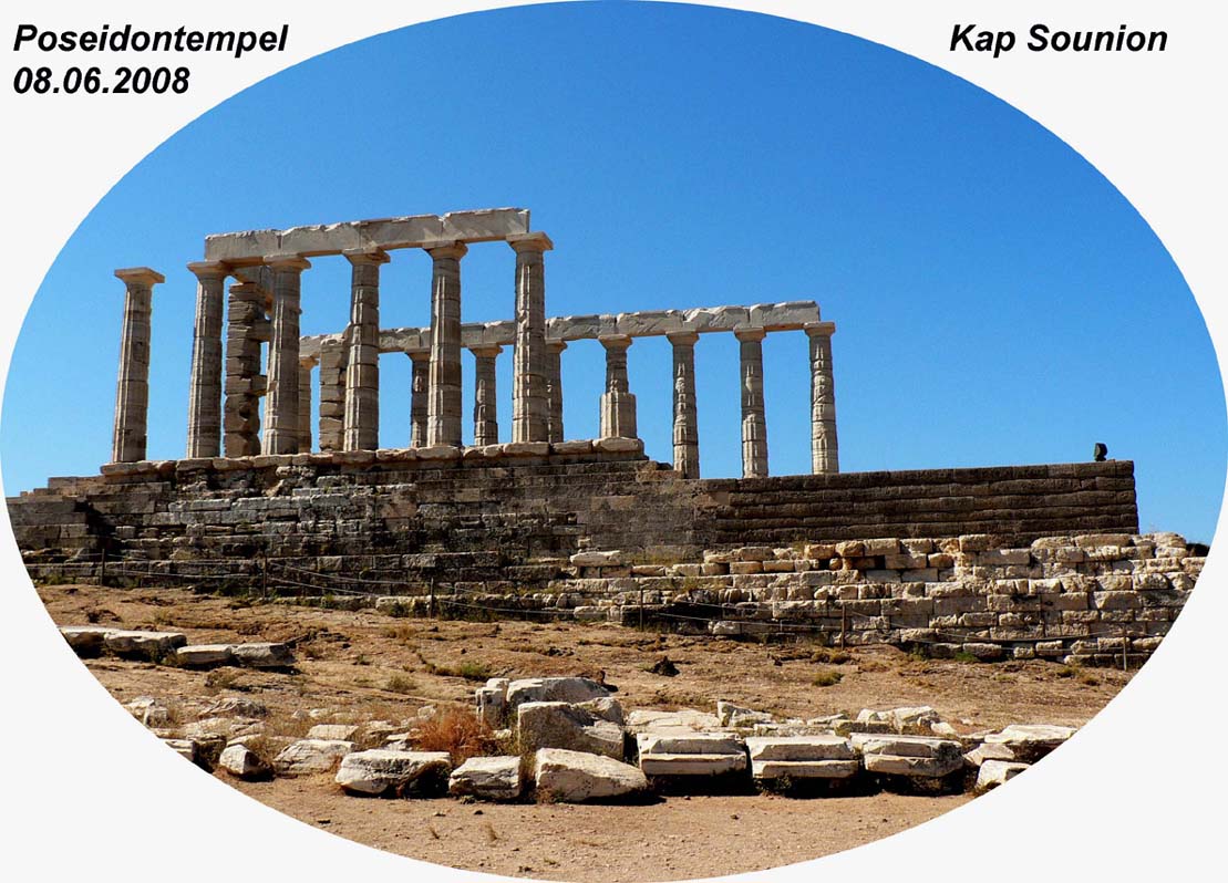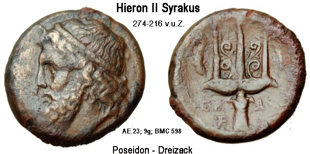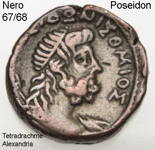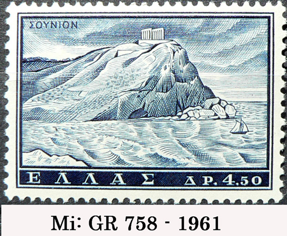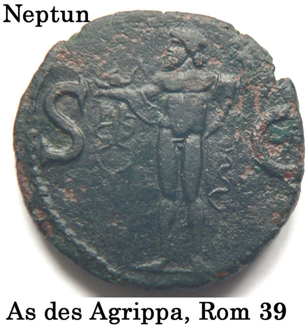 Auf dem römischen As ist Neptun abgebildet. Er steht nach links und hält einen kleinen Delphin, rechts einen Dreizack. Die griechische Briefmarke zeigt die Marmorruine des Poseidontempels auf dem Kap Sounion, der Südspitze Attikas. Der Tempel wurde um 440 v.u.Z. errichtet und war ein Ort, an dem Seeleute die Gunst des Meergottes erbitten konnten.