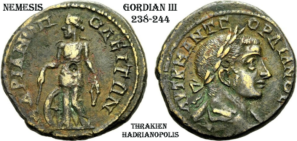 Die römische Provinzialprägung aus Thrakien zeigt im Revers die Göttin Nemesis vor dem Rad des Schicksals mit einer Peitsche. Sie wurde in der Stadt Hadrianopolis unter der Herrschaft des Soldatenkaisers Gordian III geprägt.