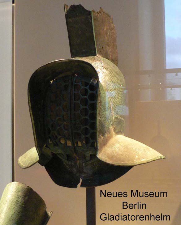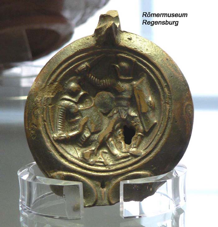 Die Öllampe zeigt einen Gladiatorenkampf zwischen Thraex und Hoplomachus. Der Helm mit Kamm, Krempe und Gesichtsschutzgitter wurde von der Gattung "Murmillo" getragen.