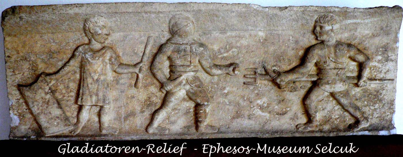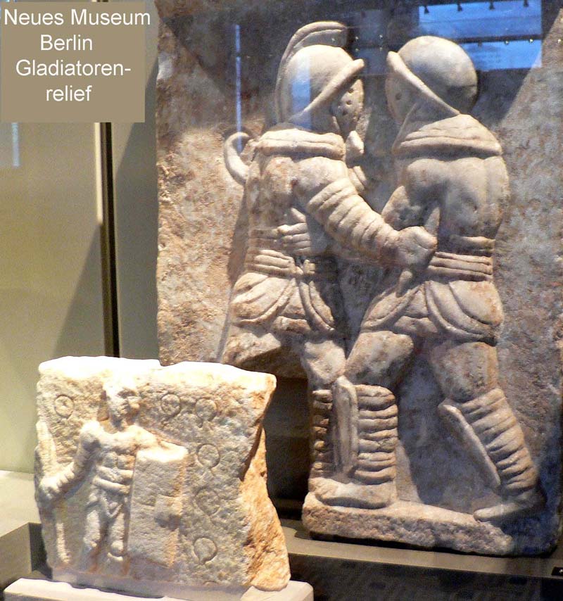 Im größeren Reliefblock wird der Gladiatorenkampf zwischen Murmillo und Thraex dargestellt.