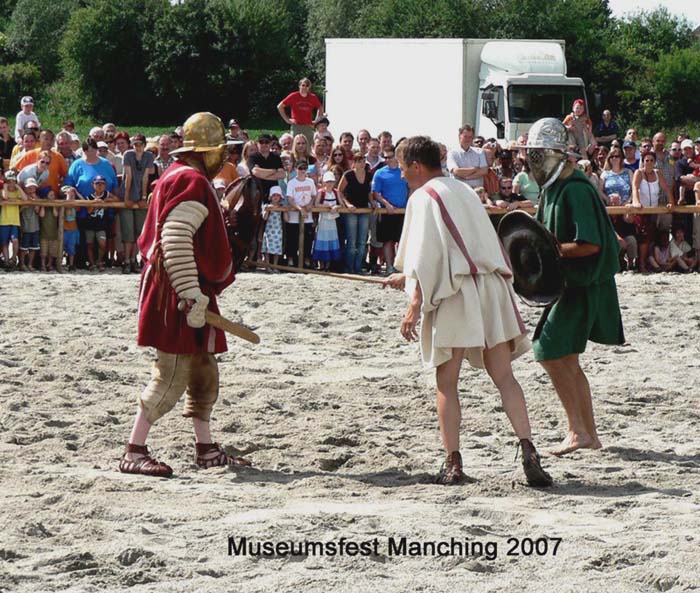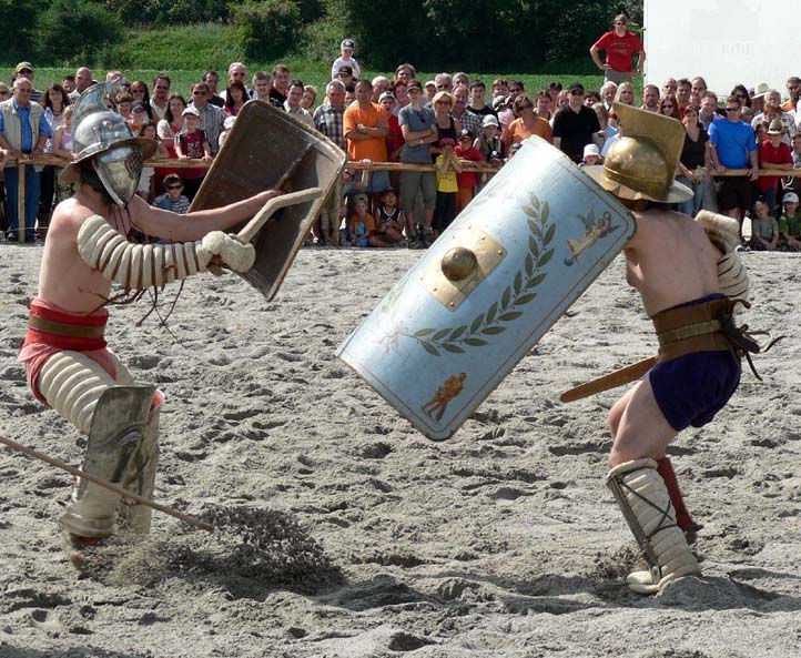 Kämpferpaar Thraex ("Thraker", Sica Kurzschwert mit geknickter Klinge, kleiner konvex gewölbter Schild, 2 hohe Beinschienen) gegen Murmillo