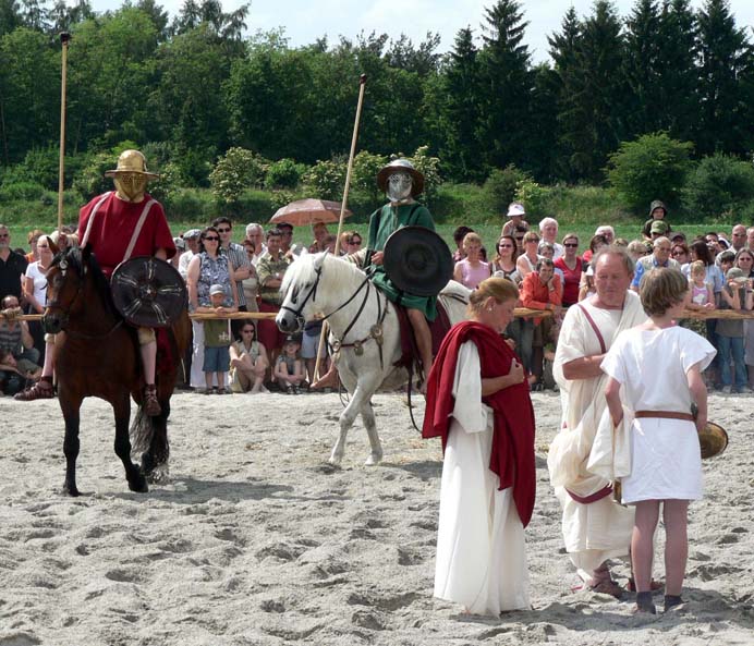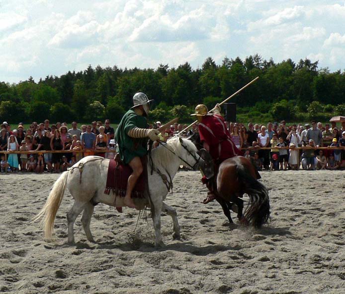 Kämpferpaar 2 Eques in der Anfangsphase zu Pferd, im Finalkampf zu Fuß mit Kampf-/Schiedsrichter
