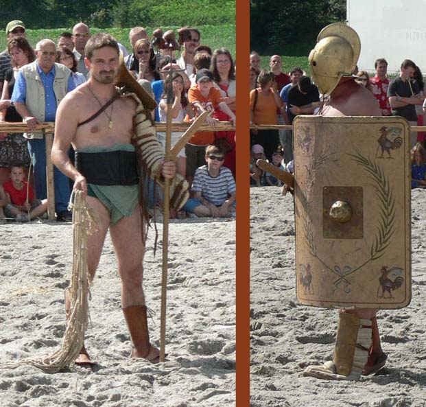 Retiarius-Ausstattung: Dreizack, Netz, Dolch und Schulterschirm, fast völlig ungeschüzt mit hoher Beweglichkeit; Secutor-Ausstattung: eiförmiger Helm mit flossenartigen Kamm, schwer gepanzert, eingeschränkte Sicht