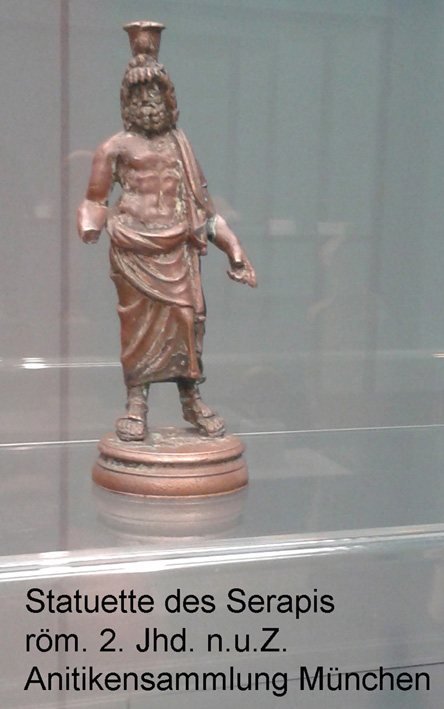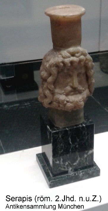 Serapis ist ein hellenistischer Gott und in der Ikonographie als sitzender, bärtiger Mann zu sehen. Als Gott der Fruchtbarkeit und in seiner Bedeutung für die Getreideversorgung trägt er einen von Ähren umwundenen Kalathos. Als Gott der Nilschwemme vereinte er neben Osiris die Wesenszüge weiterer griechischer Götter: Hades, Zeus, Helios, Dionysos und Asklepios.