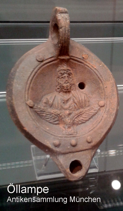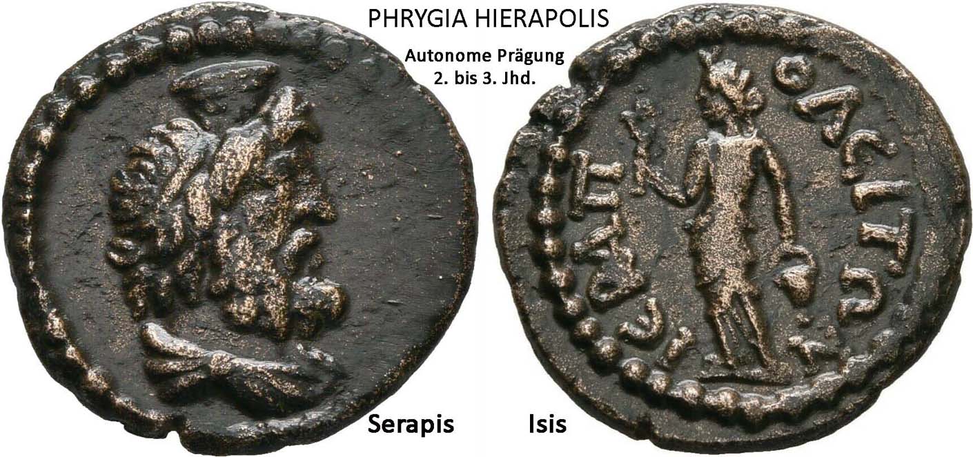 Auf der römischen Provinzialmünze der phrygischen Stadt Hierapolis aus dem 2. bis 3. Jahrhundert n.u.Z. ist vorderseitig die Büste des Serapis und rückseitig die Standfigur der Isis mit Sistrum und Situla abgebildet.