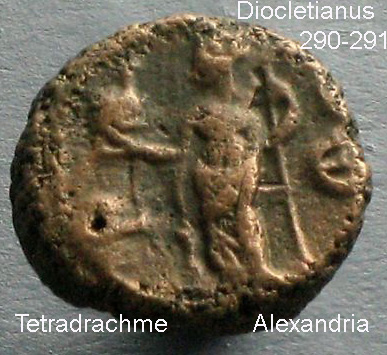Die Münze des Diocletianus bildet die Stadtgöttin Alexandria ab. Sie hält den Serapiskopf und dokumentiert damit die enge Verbundenheit der Stadt mit dieser hellenistischen Gottheit. Kaiser Diokletian war der Begründer einer neuen Herrschaftsform. Die Viererherrschaft (Tetrarchie) stabilisierte das Römische Reich nach den Wirren der Soldatenkaiserzeit.
