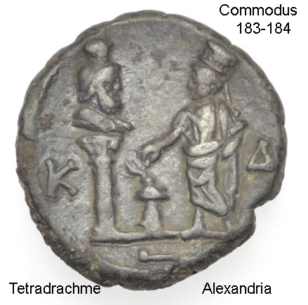 Die Tetradrachme des Kaisers Commodus zeigt ihn als Priester bei einem Opferritus am Altar des Serapis.
