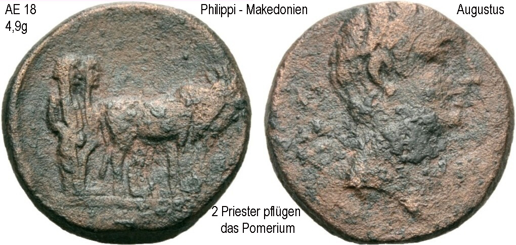 Die makedonische Provinzialmünze aus augusteischer Zeit zeigt zwei verschleierte Priester mit Ochsengespann, die im Rahmen einer Koloniegründung das Pomerium nach rechts pflügen.