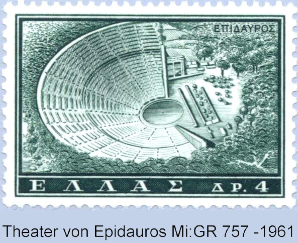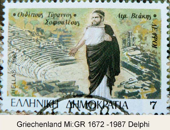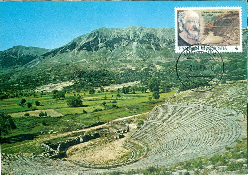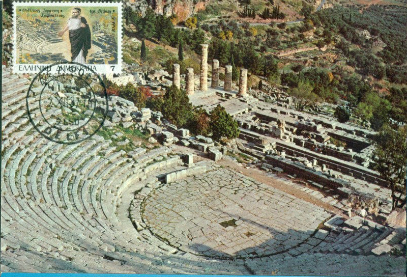 Das Theater in Delphi, auf der Maximumcard und der Briefmarke abgebildet,