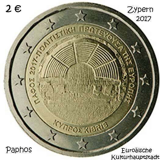 "Die erste eigene nationale 2-Euro-Gedenkmünze Zyperns zeigt das römische, im 2. Jahrhundert erbaute Odeon, das nach der Rekonstruktion heute wieder für Musik- und Theateraufführungen genutzt wird. Der Archäologische Park Paphos wurde 1980 zum Weltkulturerbe erhoben, Paphos Kulturhauptstadt Europas 2017. „ΠΑΦΟΣ 2017 – ΠΟΛΙΤΙΣΤΙΚΗ ΠΡΩΤΕΥΟΥΣΑ ΤΗΣ ΕΥΡΩΠΗΣ“ (Paphos 2017 – Kulturhauptstadt Europas) und „ΚΥΠΡΟΣ KIBRIS“ (Zypern) stehen kreisförmig um das von Georgios Stamatopoulos gestaltete Motiv." Quelle Wikipedia