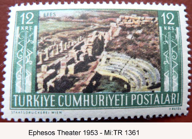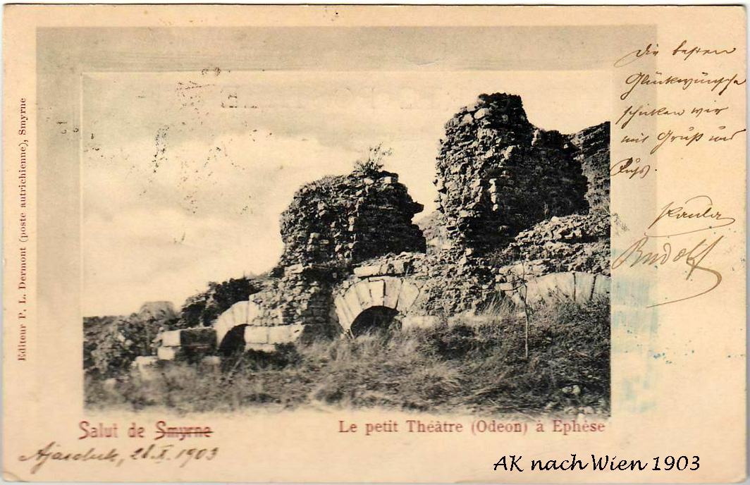 Diese Ansichtskarte aus dem Jahr 1903 wurde vom österreichen Archäologen Rudolf Heberdey an seinen Bruder, den Mineralogieprofessor Philipp Heberdey verschickt. Rudolf Heberdey (1864 bis 1936) war ab 1898 Leiter der Zweigstelle des Österreichischen Archäologischen Instituts in Smyrna und von 1898 bis 1913 Leiter der Ausgrabung in Ephesos, ab 1904 Leiter der Zweigstelle Athen. Von 1909 bis 1911 war er Professor für Klassische Archäologie in Innsbruck, danach bis 1934 in Graz. Die alte Karte zeigt angeblich das Odeon. Zu Heberdeys Zeit fanden jedoch keine Ausgrabungen an diesem Objekt statt. Grabungen erfolgten von 1929 bis 1979 und sind auch heute noch nicht abgeschlossen. Sie führten zu dem Ergebnis, dass es sich um eine Thermenanlage, ein Dampfbad für das Gymnasium handelte.
