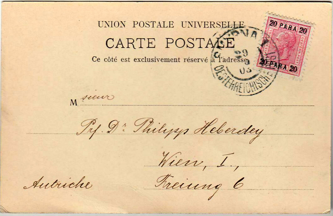 Desweiteren zeigt dieses interessante postalische Belegstück, dass der Briefverkehr des Österreichischen Archäologischen Instituts in Smyrna (heute Izmir) in die Heimat durch die Österreichische Post vor Ort durchgeführt wurde.