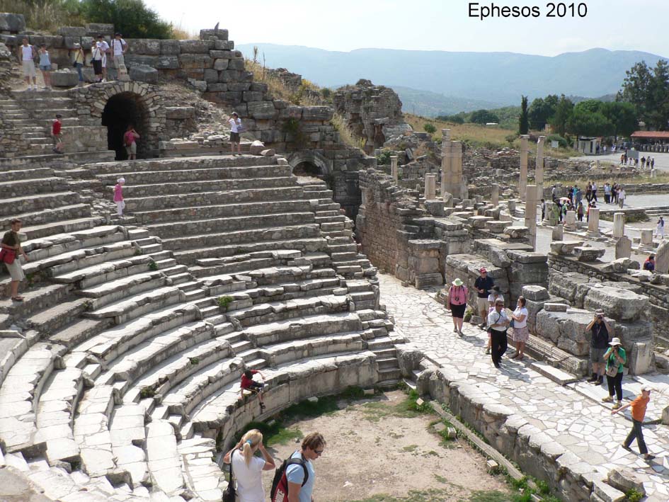 "Zu den beeindruckenden Funden gehört das wohl in der zweiten Hälfte des 2. Jahrhunderts errichtete Theater, das sich östlich unterhalb der Palastterrasse befindet. Auf dem Scheitel der oberen Stadt und eher im Osten gelegen, wurde es mit seinem Zuschauerrund, der cavea, in den Fels gearbeitet. Die Cavea hatte einen Durchmesser von 53 Metern und bot mit ihren 23 Sitzreihen etwa 3500 Zuschauern Platz. Das zugehörige Bühnengebäude, die scaena frons, war 13 × 36 Meter groß und weist, was im Verhältnis zu anderen antiken Theatern Zyperns wie etwa dem von Kourion ungewöhnlich ist, nur eine Bauphase auf und stammt, nach der Architekturdekoration seiner Scaena frons zu urteilen, aus der Zeit des Antoninus Pius oder eines seiner Nachfolger." Quelle: Wikipedia