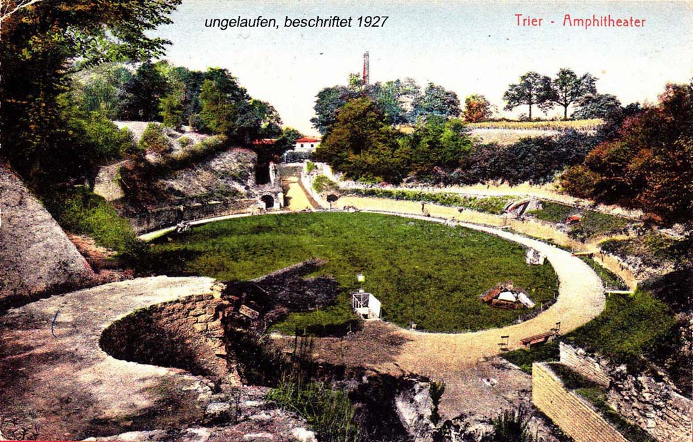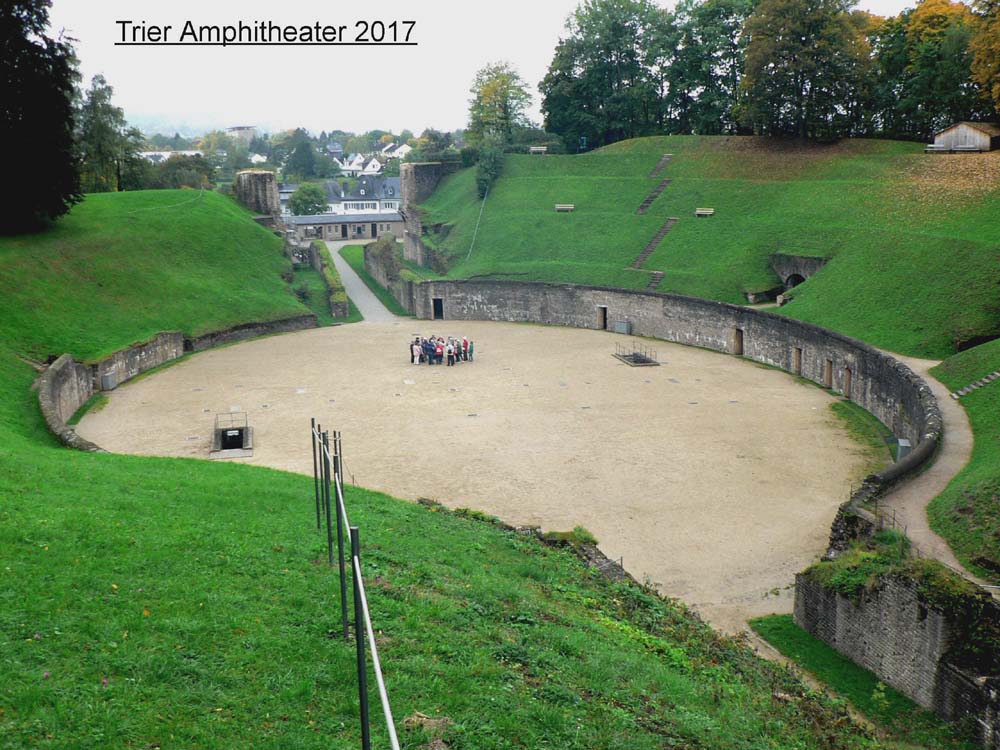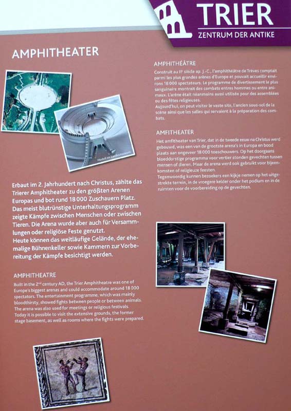 Das Amphitheater wurde am Ende des 2. Jahrhunderts n.u.Z. errichtet und bot etwa 18.000 Zuschauern Platz. Die steinernen Sitzreihen wurden in einen aufgeschütteten Hang eingebaut. Die ellipsenförmigen Anlage ist 210 m lang und zwischen 120 m und 150m breit. Das Amphitheater besaß 2 Hauptzugänge im Süden und Norden, so wie zwei seitliche im westlichen Bereich. Im Arena-Areal wurden Reste von wasserundurchlässigem Mörtel lokalisiert. Vor dem Einbau der Kelleranlagen sowie der Hebe- und Aufzugseinrichtungen im 3. Jahrhundert konnten Wasserflutungen für Naumachien durchgeführt werden. Gefundene und dendrologisch untersuchte Holzreste verweisen auf das Jahr 294 in die Zeit der Tetrarchie.