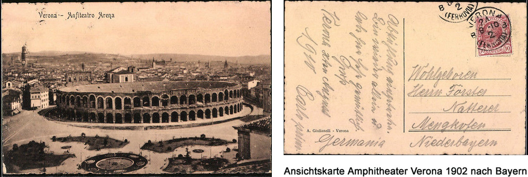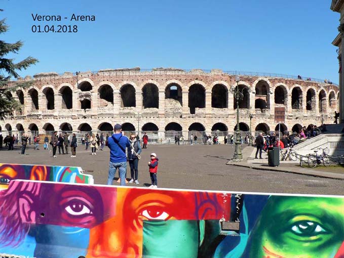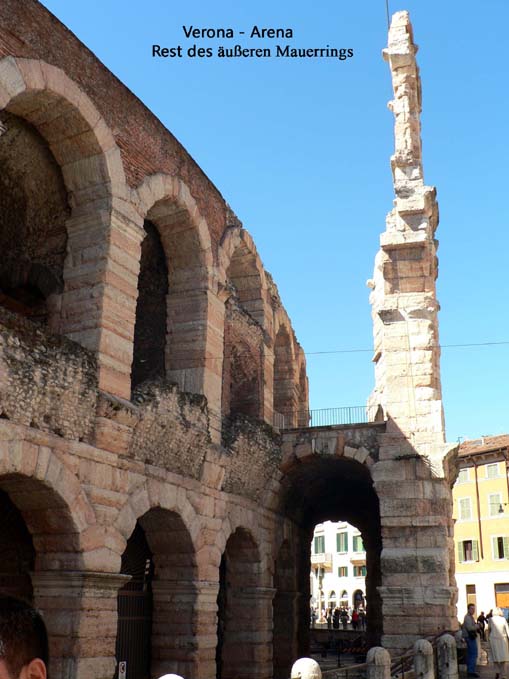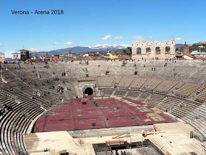 Das ursprünglich dreigeschossige Amphitheater wurde in der frühen Kaiserzeit errichtet und konnte etwa 30.000 Zuschauer aufnehmen. Die Außenmaße des Bauwerks betragen ca. 152 x 123 m, die Arena mißt 76 x 44 m. Von den ca. 300 Amphitheatern im Römischen Reich belegte Verona im Größen-Ranking den 8. Platz, in Italia hinter Rom, Capua und Mailand den 4. Platz. Auch in nach-antiker Zeit war die Arena ein kulturelles Zentrum und ist deshalb sehr gut erhalten.